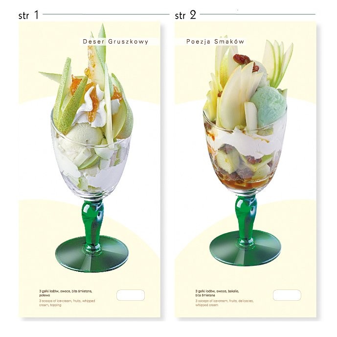 Strona 1: Deser Gruszkowy: 3 gałki lodów, owoce, bita śmietana, polewa